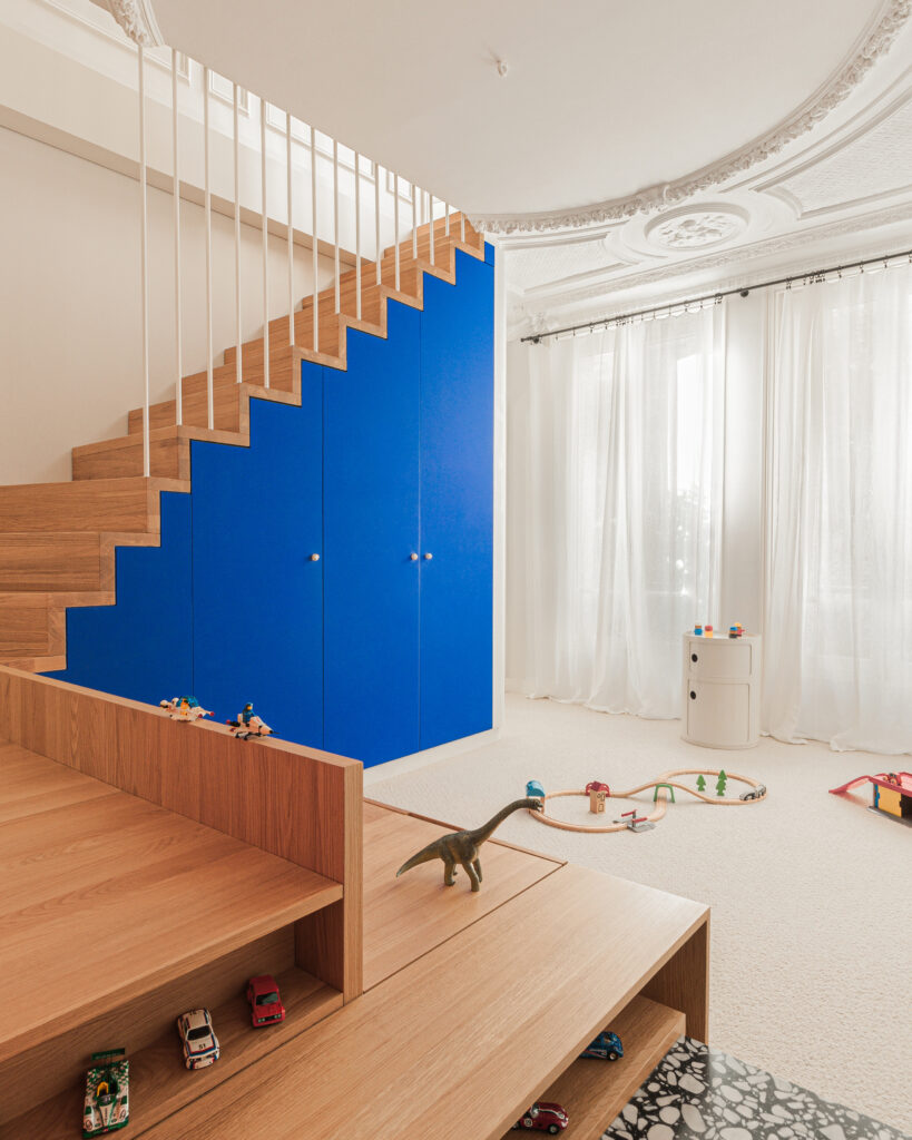Ce sont les marches, les lignes et les angles qui, ici, mettent en valeur les arrondis des moulures anciennes.